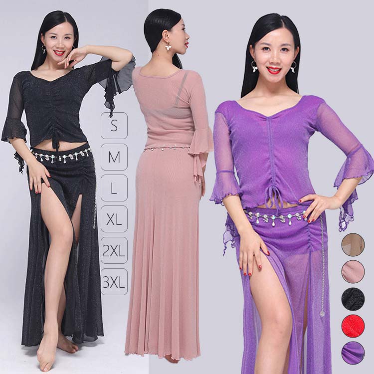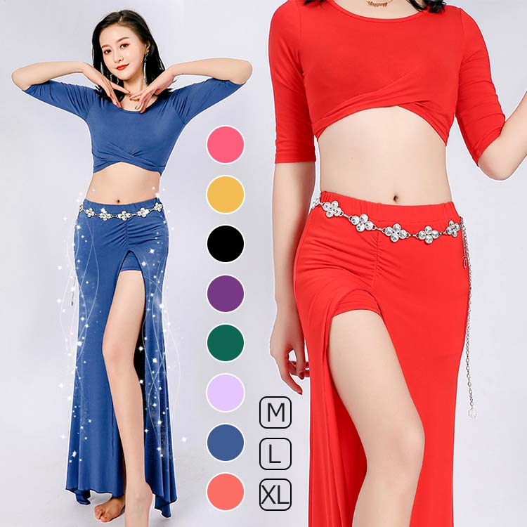 ベリーダンス レッスン着 セットアップ 衣装 セット 半袖 トップス 単品 ロング丈 スカート 2点セット 五分袖 前クロス お腹出し ベリーダンス衣装 無地 9color M L XL
