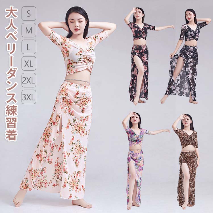ベリーダンス衣装 セットアップ レッスン着 2点セット スリットスカート シースルー セクシー 社交ダンスウェア 大人 半袖 Vネック トップス ロングスカート 女性 ダンス衣装 セット