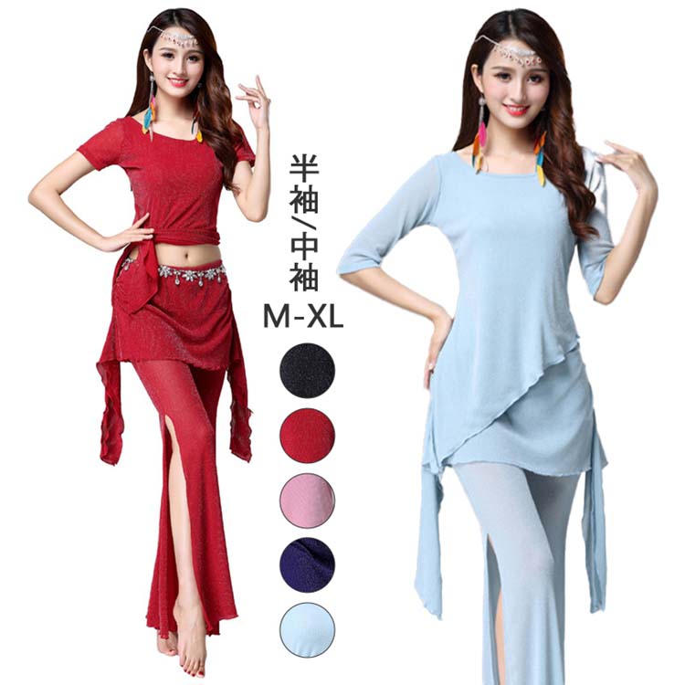 全6色選べる 半袖ブラウス 上下2点セットアップ レッスン着 キラキラ 社交ダンス衣装 スリット入 ベリーダンス衣装 ロング ショートスカート レディース ラメ入り 練習着