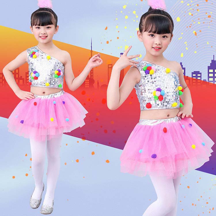 片掛け肩ブラウス+チュールスカート上下2点セット 子供ジュニ舞台演出衣装 スパンコールジャズダンス衣装 可愛いポンポン付 子供ダンス衣装 女の子ヒップホップダンス衣装