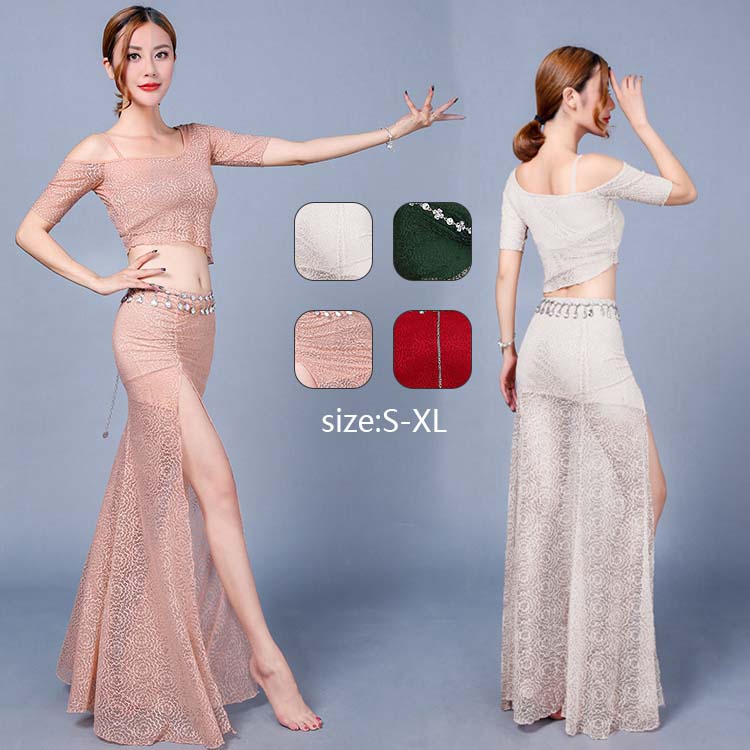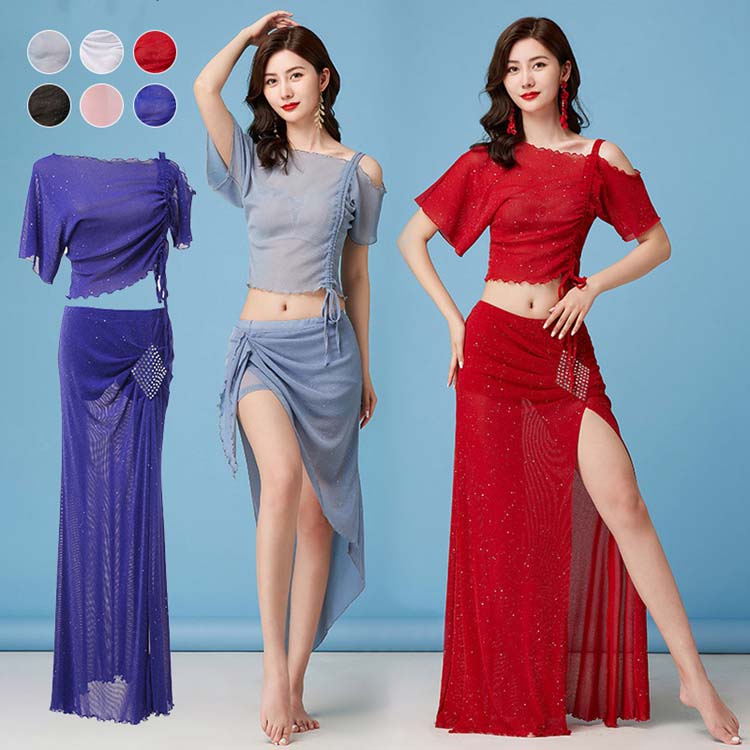 ベリーダンス衣装 セットアップ レッスン着 2点セット スリットスカート シースルー セクシー 社交ダンスウェア 大人 半袖 ネック トップス ロングスカート 女性 ダンス衣装 セット
