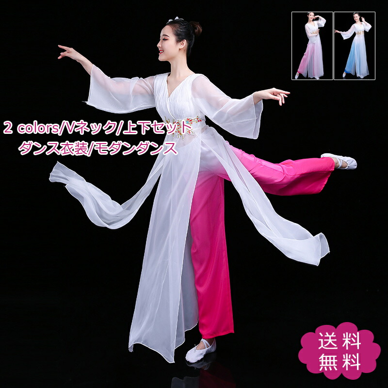 ダンス衣装 レディース 中国民族風ダンス衣装 チャイナダンスウェア ロングワンピース ワイドパンツ モダンダンス Vネック 上下セット きれいめ