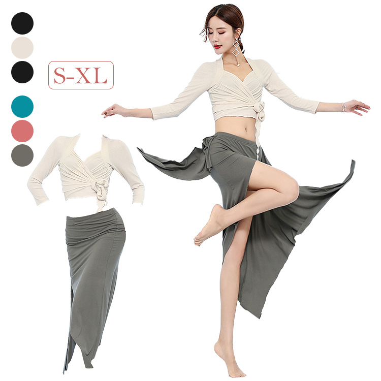 ベリーダンス 衣装 レッスン着 長袖 トップス ロング丈スカート 白 黒 Vネック 前クロス 無地 黒 肩出し 丸襟 キラキラ 2種類 自由に選べる セットアップ ラテンダンス