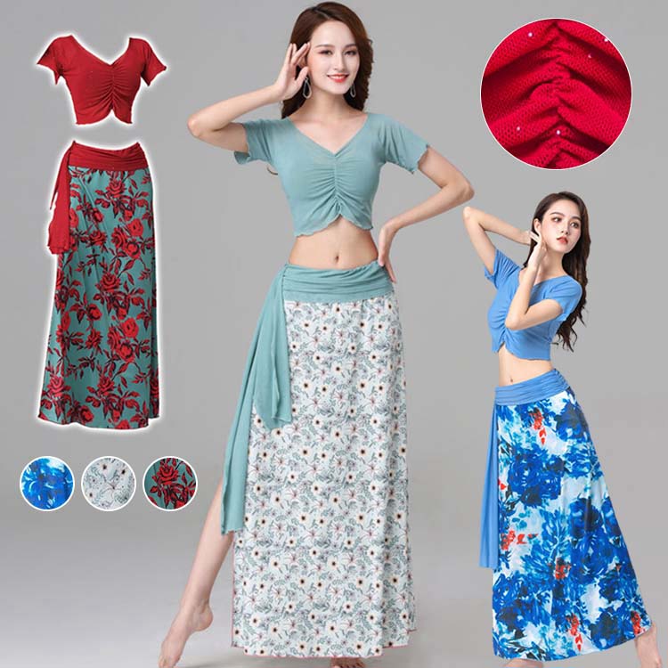 ベリーダンス レッスン着 セットアップ 衣装セット トップス スカート Vネック 半袖 ロング丈 2点セット 夏 赤 青 花柄 ロングスカート 上質 セクシー ラテンダンス