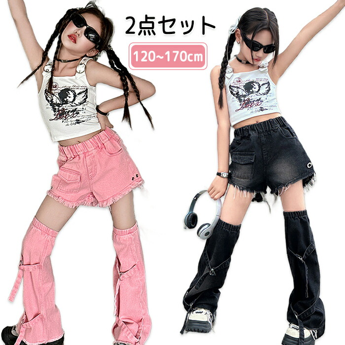 ダンス衣装 派手 へそ出し - キッズ ダンス衣装 セットアップ キッズ 女の子 デニム 足カバー タンクトップ ヒップホップ ジャズ 着痩せ 練習着 チアガール 演出服 応援団