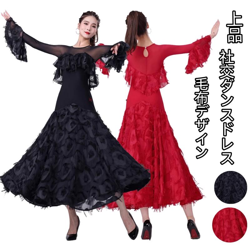 社交ダンス レディース 立体フリル回り モダンダンス衣装 ダンスドレス 衣装 ワンピース 社交ダンス衣装 広がる裾スタンダード レッスン着 競技着 演出用 高級感 踊りドレス 大人気