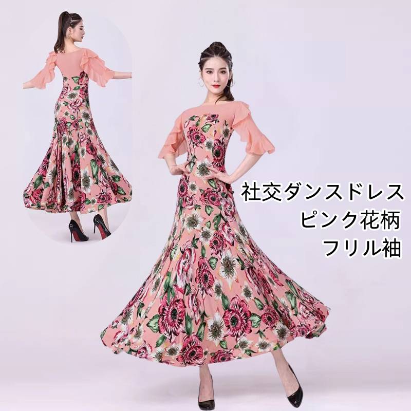 社交ダンス レディース ピンク花柄 フリル袖 モダンダンス衣装 ダンスドレス ワンピース 社交ダンス衣装 広がる裾スタンダード レッスン着 競技着 演出用 高級感 踊りドレス 大人気