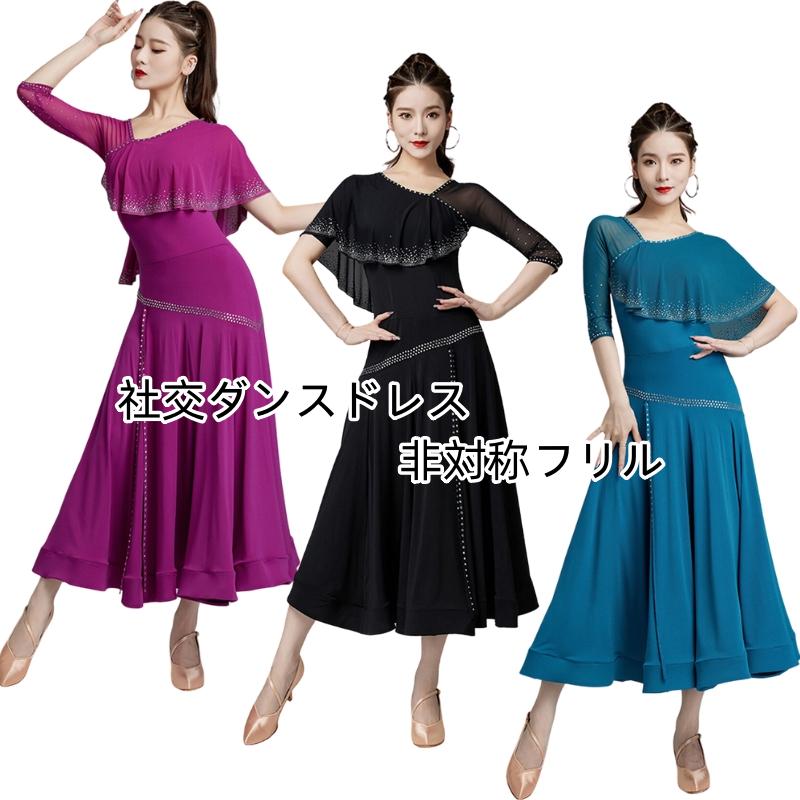 社交ダンス レディース 非対称フリル モダンダンス衣装 ダンスドレス 衣装 ワンピース 社交ダンス衣装 広がる裾スタンダード レッスン着 競技着 演出用 高級感 踊りドレス 大人気