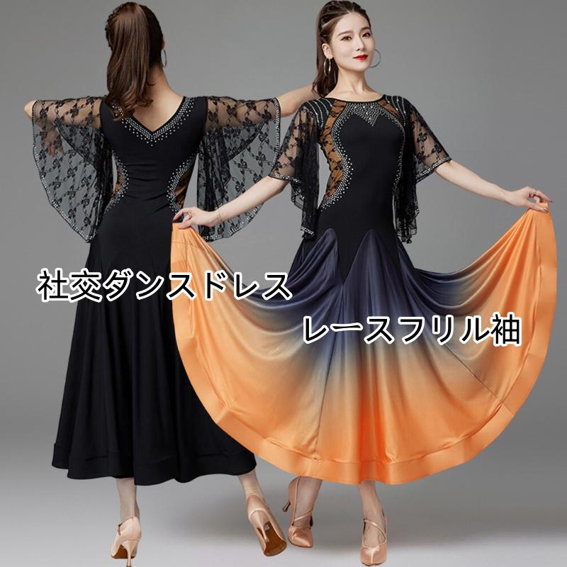 社交ダンス レディース ダンスドレス 衣装 ワンピース レースフリル袖 モダンダンス衣装 社交ダンス衣装 広がる裾スタンダード レッスン着 競技着 演出用 高級感 踊りドレス 大人気