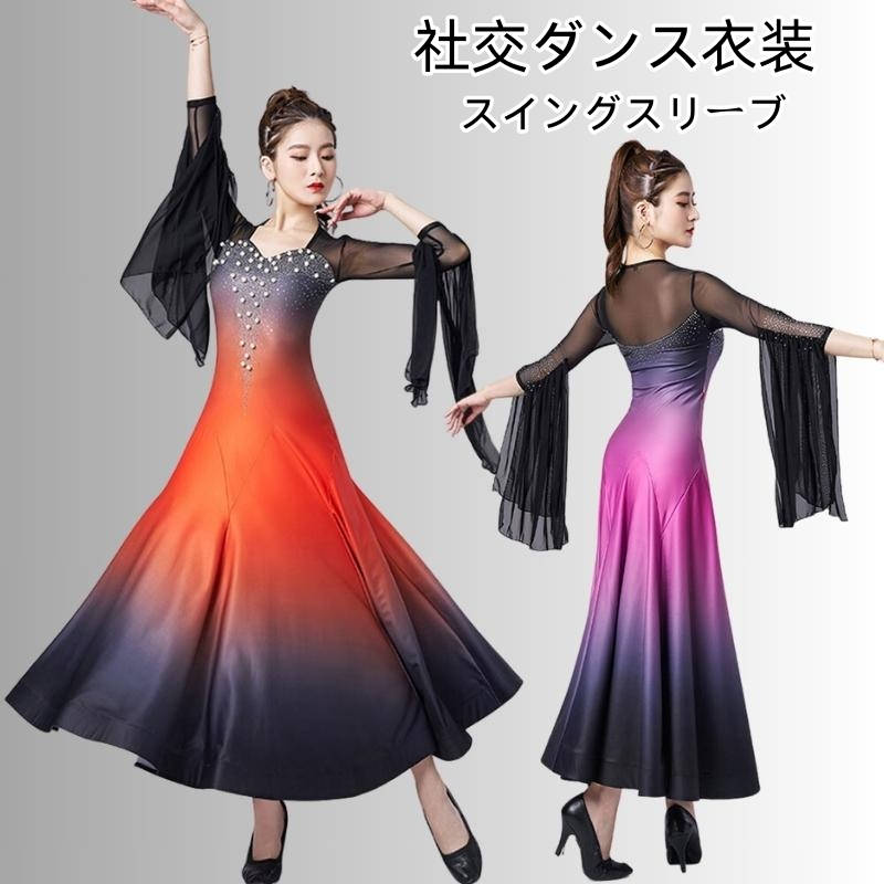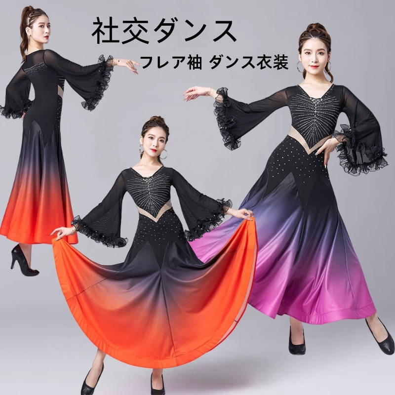 社交ダンス レディース ダンスドレス 衣装 ワルツ ワンピース フレア袖モダンダンス衣装 社交ダンス衣装 広がる裾スタンダード レッスン着 競技着 演出用 高級感 踊りドレス 大人気