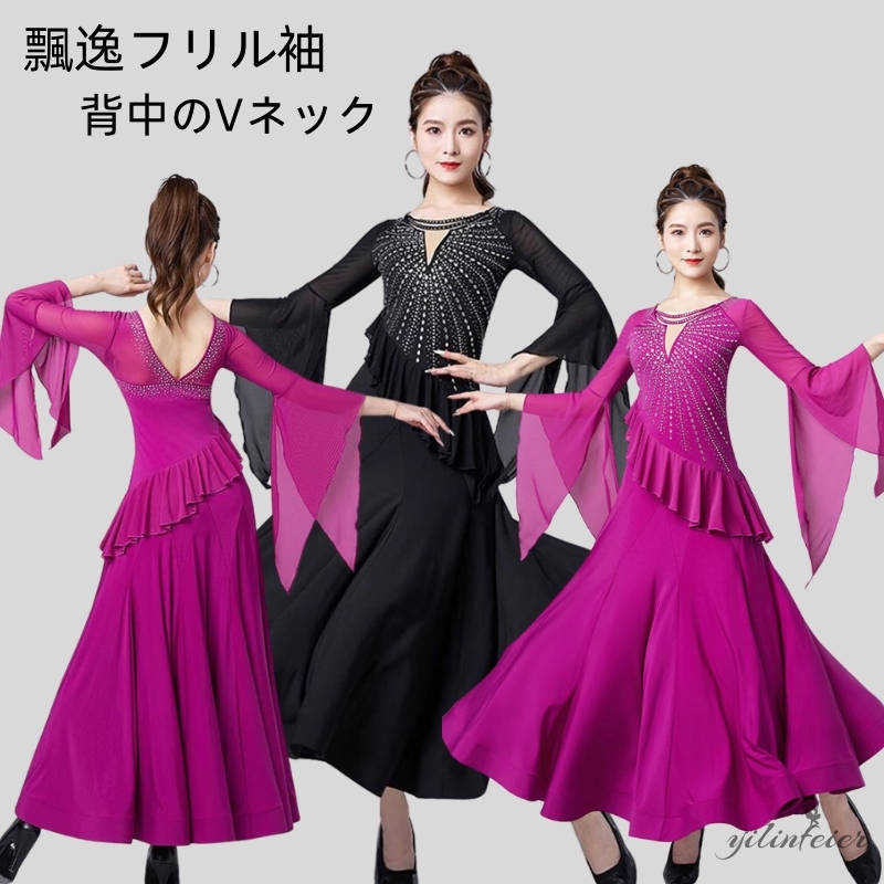 社交ダンス レディース ダンスドレス 衣装 ワルツ ワンピース 飄逸フリル袖モダンダンス衣装 社交ダンス衣装 広がる裾スタンダード レッスン着 競技着 演出用 高級感 踊りドレス 大人気