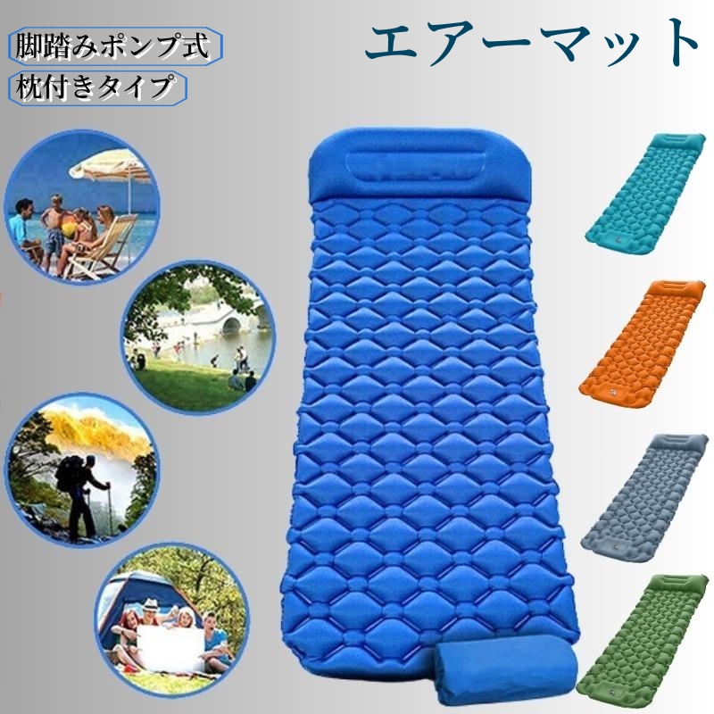 エアーマット キャンプマット エアマット 防水防潮 エアーベッド キャンプ用品 折り畳み 枕付き 収納袋付き 足踏み式 軽量ツーリングエアーマット シングルサイズ 40ナイロン+生地