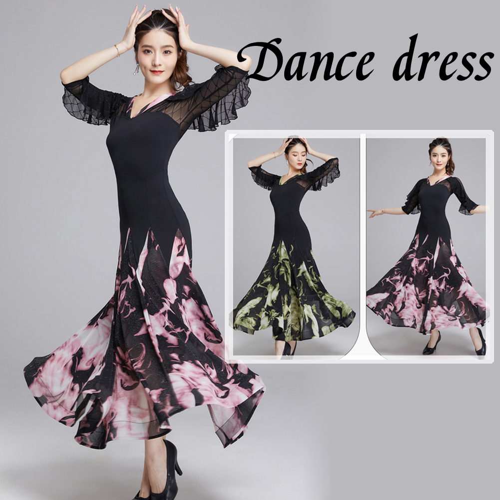 社交ダンス レディース ダンスドレス 衣装 ワンピース レースフリル袖 モダンダンス衣装 社交ダンス衣装 広がる裾スタンダード レッスン着 競技着 演出用 高級感 踊りドレス 大人気
