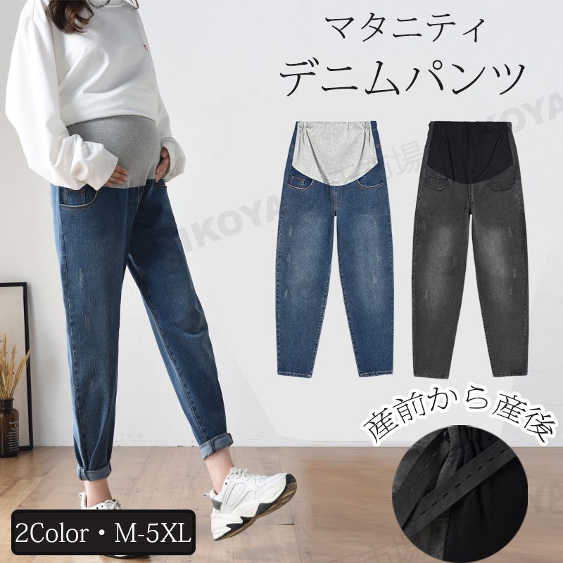 脚を細くみせるデニムパンツ マタニティパンツ マタニティデニム アジャスター付きで産前から産後まで対応 高伸縮性 動きやすい 妊婦服 デニムパンツ ブルー グレー