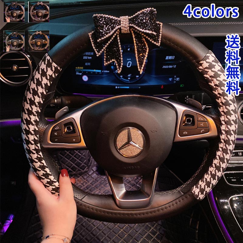 ハンドルカバー 軽自動車 麻綿 革 ステアリングカバー おしゃれ O型 千鳥格子 蝶結び ジムニー フィット ヴォクシー エブリィワゴン