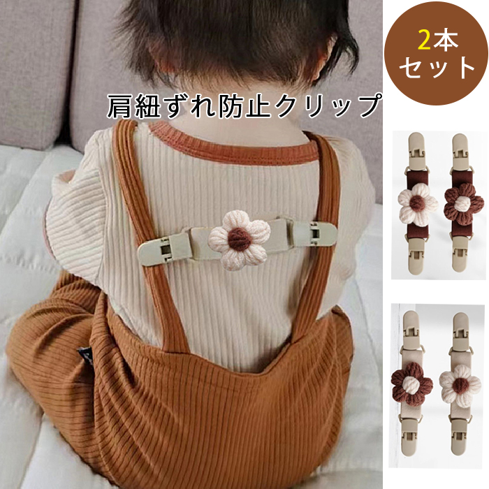 2本セット 取付簡単 肩紐ずれ防止クリップ 肩紐ずり落ち防止クリップ 子供 サロペット オーバーオール お花のかわいい 小さなお子様に最適 両肩紐 ベージュ ブラウン