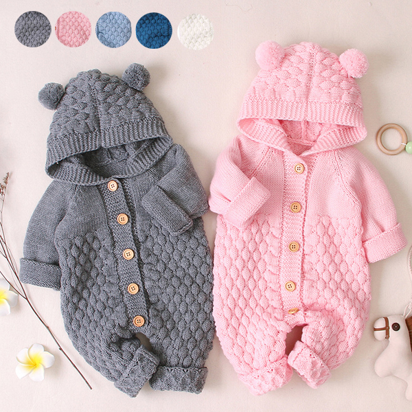 ロンパース ベビー 着ぐるみ ニット 赤ちゃん用ロンパース フード付き 女の子 男の子 ポンポン オーバーオール 幼児 子供服