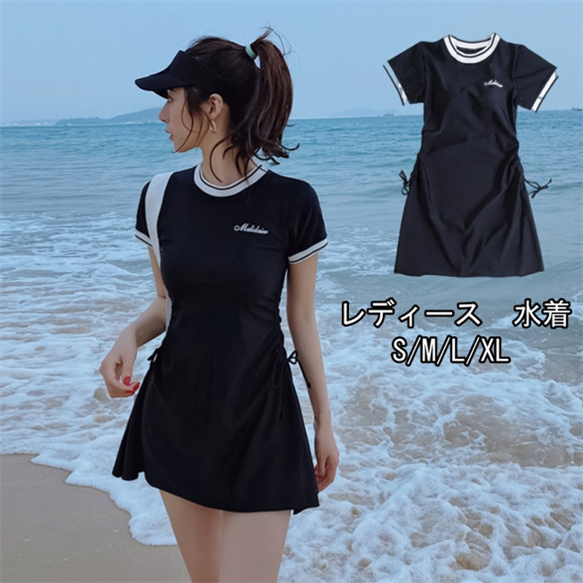 ブラック黒ワンピース水着 半袖 体型カバー ビキニ 水着 レディース 大きいサイズ オトナ女子 太もも カバーアップ セクシー ビーチ 小胸 盛れる スクール ショートパンツ バックシャン 海水浴 可