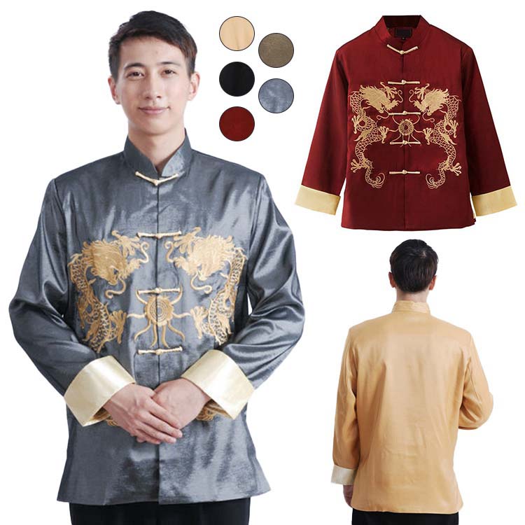 メンズチャイナドレス メンズチャイナ服 前開きチャイナブラウス 中国風龍刺繍ジャケット チャイナカラー 年会イベントステージ衣装 漢服唐装 華流コスプレ衣装 中華風舞台演出衣装