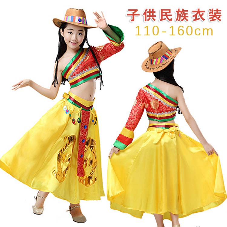 ステージ服 へそ出しブラウス+フレアスカート 中国民族舞踊ダンス衣装 三七五学園祭イベント舞台衣装 幼稚園小学校演出衣装 帽子あり三点セット 民族衣装 110-160子供ダンス衣装