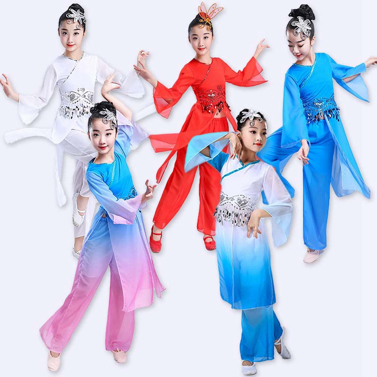 女の子漢服 振袖民族風舞台衣装 女の子幼稚園小学校合唱団体服 カンフー衣装 バイカラー 袖ダンス 5色 二点セット 中国風古典ダンス衣装 コスプレ衣装 扇子ダンス 子供ダンス衣装