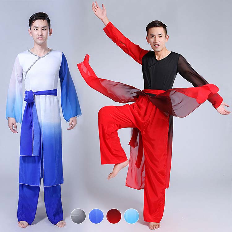 カンフー 大人 武術 舞台衣装 振り袖 グラデーション ブルー 華流 中華 シフォン チャイナ風ダンスウェア2点セット チャイナ民族風ダンス衣装 長袖 メンズ 衣装 ステージ衣装