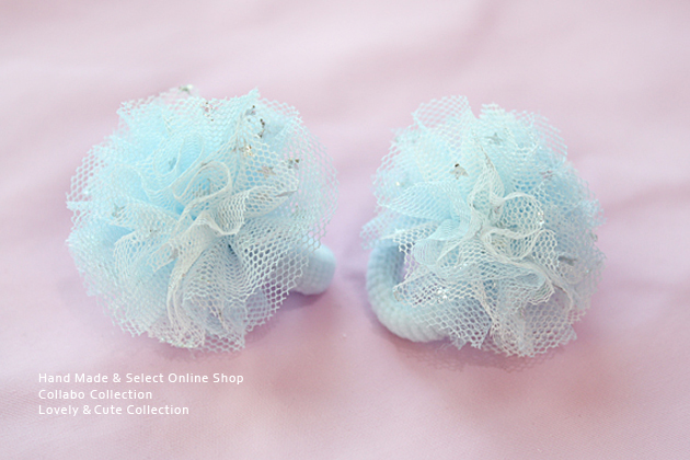 2color◎ホワイト星柄&アイスブルー無地チュールボンボンデザイン キッズ 子供 ヘアアクセサリー 髪留め 髪飾り 保育園 幼稚園 チュール
