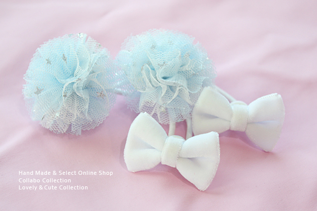 2color◎ホワイト星柄&アイスブルー無地チュールボンボン&ホワイトベロアりぼんデザイン キッズ 子供 ヘアアクセサリー 髪留め 髪飾り 保育園 幼稚園 チュール