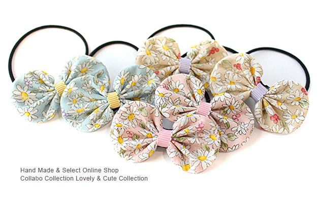 ホワイトガーベラ柄袋りぼんデザイン キッズ ヘアゴム ヘアアクセサリー 髪飾り 髪留め 保育園 幼稚園 袋りぼん