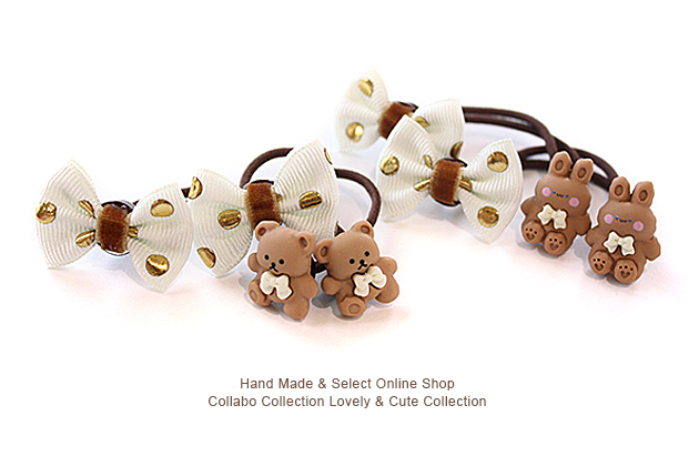 アンティークアイボリーりぼん& りぼん付きベアーラビットパーツデザイン キッズ ヘアアクセサリー 子供 ヘアゴム 幼稚園 保育園 デイリー りぼん パーツ