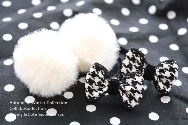 アイボリーminiフェイクファーボンボン&千鳥柄りぼんデザイン ヘアゴム キッズ 子供 ヘアアクセサリー 幼稚園 小学校 保育園 女の子 フェイクファー モノトーン
