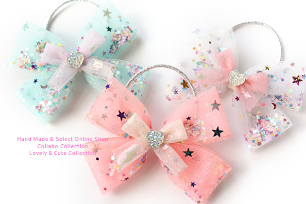 キラキラりぼんパーツ付き◎2color◎ホワイト星柄&アイスブルー無地チュールボンボンデザイン キッズ 子供 ヘアアクセサリー 髪留め 髪飾り 保育園 幼稚園 チュール