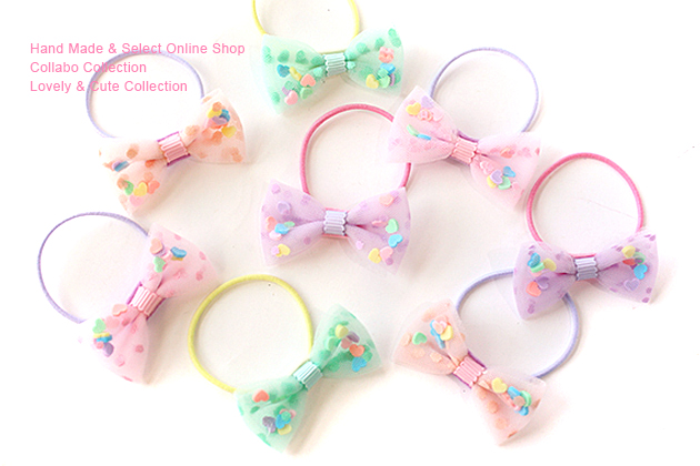水玉チュール一段りぼん◎カラフルハート型チップ入りデザイン ヘアゴム キッズ 子供 ヘアアクセサリー 髪飾り 髪留め 保育園 幼稚園 チュール りぼん ハート