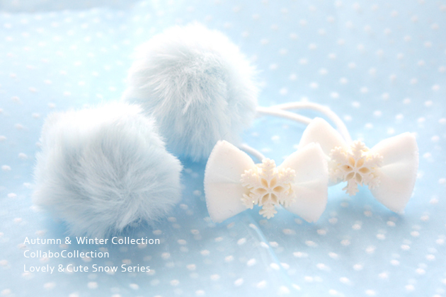 アイスブルーフェイクファーボンボン&ホワイトベロアりぼん◎雪の結晶付きデザインキッズ ベビー マタニティ キッズファッション ヘアアクセサリー ヘアゴム