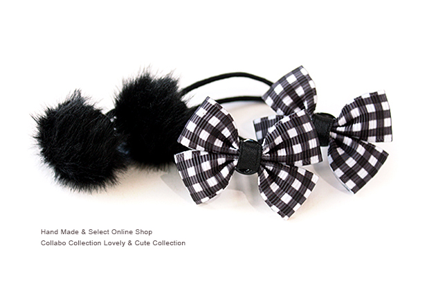 15mm幅ブラックチェック柄ダブルりぼん&miniフェイクファーボンボンパーツデザイン 子供 キッズ ヘアゴム ヘアアクセサリー 髪飾り 髪留め 幼稚園 保育園 りぼん チェック フェイクファー