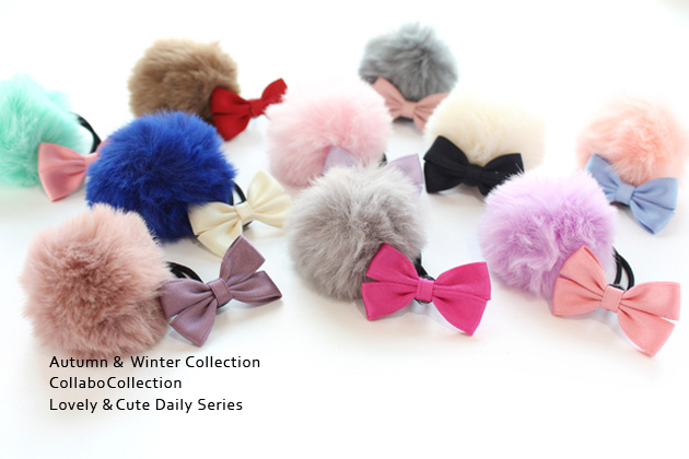 フェイクファーボンボン&15ダブル上質サテンりぼんデザイン キッズ 子供 ヘアゴム ヘアアクセサリー 髪飾り 髪留めフェイクファー りぼん