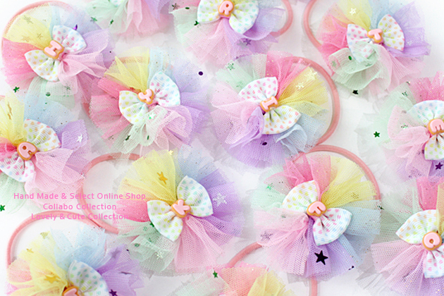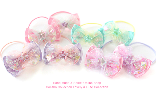 オーロラチュールmini袋りぼん&サテン水玉りぼん◎ クリアスターパーツ付きデザイン ヘアゴム キッズ 子供 ヘアアクセサリー 髪飾り 髪留め 保育園 幼稚園 チュール りぼん 星