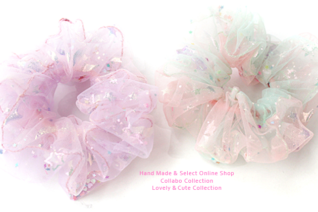 2色オーロラチュール◎クリアスターパーツ&ホログラム入りデザイン キッズ ヘアゴム 子供 髪留め ヘアアクセサリー シュシュ ゆめかわ 髪飾り