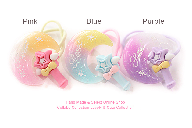 ラメ入りカラー◎ムーンパーツ& りぼん付き星型ステッキパーツデザイン ヘアゴム キッズ 子供 髪飾り パーツ 可愛い ヘアアクセサリー 幼稚園 小学校 保育園 星 スター