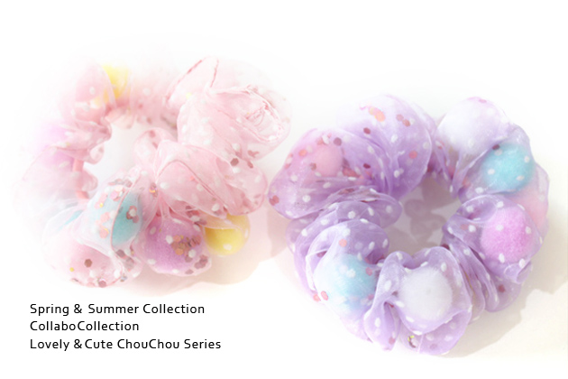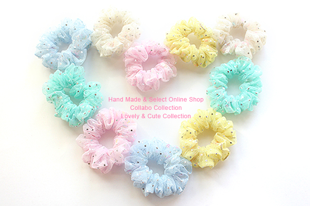 オーガンジー水玉デザイン◎ポンポン&ホログラム入り キッズ ヘアゴム 子供 髪留め ヘアアクセサリー シュシュ