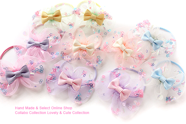 スペースカラー◎ミニドットチュール袋りぼん◎ ポンポン入り&りぼん付きデザイン ヘアゴム キッズ 子供 ヘアアクセサリー 髪飾り 髪留め 保育園 幼稚園 チュール りぼん 袋りぼん