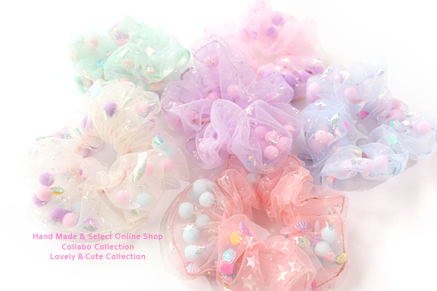 オーロラチュール◎ポンポン&シェルホログラム入りデザイン キッズ ヘアゴム 子供 髪留め ヘアアクセサリー シュシュ ゆめかわ 髪飾り