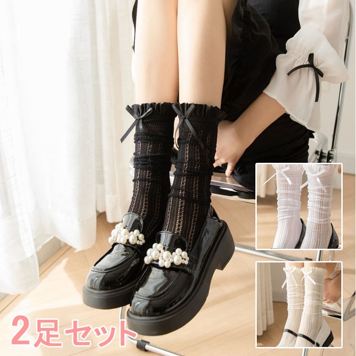 靴下 レディース ソックス ハイソックス おしゃれ リボン 女の子 黒 白 ブラック ホワイト ベージュ ロリィタ 甘ロリ 可愛い レース 地雷系 靴 ゆめかわ くしゅくしゅ靴下 レトロ シースルー