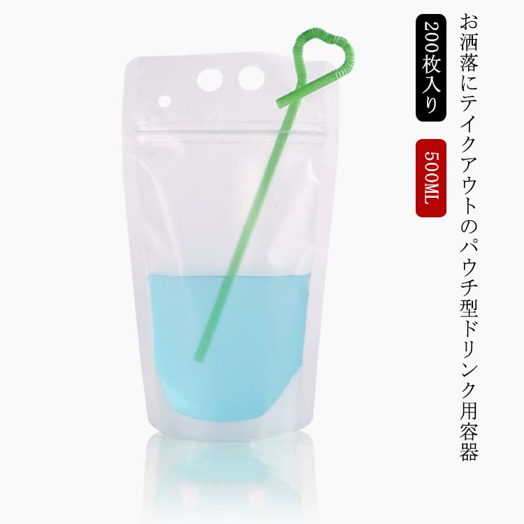 200枚入り 500 ドリンクパウチ ストロー付き ドリンクパック 持ち手付き スタンドパウチキッチン用品 食器 調理器具 食器 カトラリー グラス 使い捨て食器 使い捨てカップ