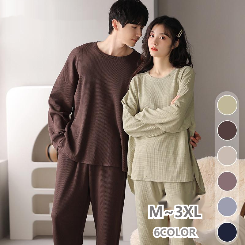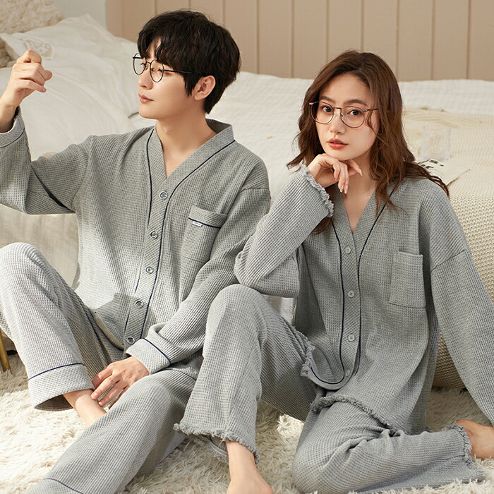 ペアパジャマ カップル 長袖 前開き 結婚祝い プレゼント クルーネック ins 春夏秋 ルームウェア レディース メンズ 上下セット 韓国風 シンプル ワッフル カジュアル ペアルック 部屋着 ナイ