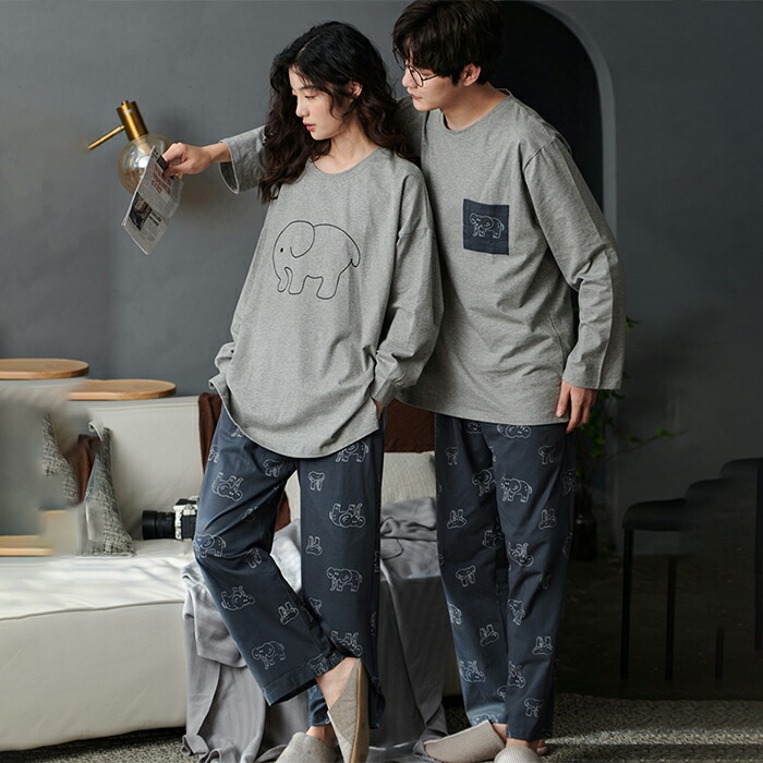 ペアパジャマ カップル 長袖 前開き 結婚祝い プレゼント クルーネック ルームウェア レディース メンズ 上下セット 春夏秋 韓国風 エレファント プリント カジュアル ペアルック 部屋着