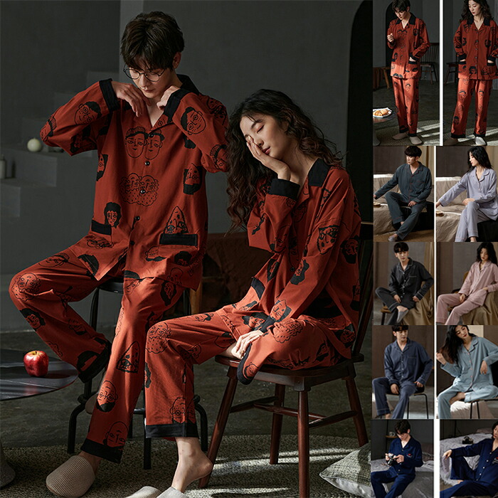 ペアパジャマ カップル ルームウェア レディース メンズ 上下セット 長袖 前開き シンプル 無地 プリント カジュアル ペアルック 部屋着 ナイトウエア 結婚祝い プレゼント ネック 春夏
