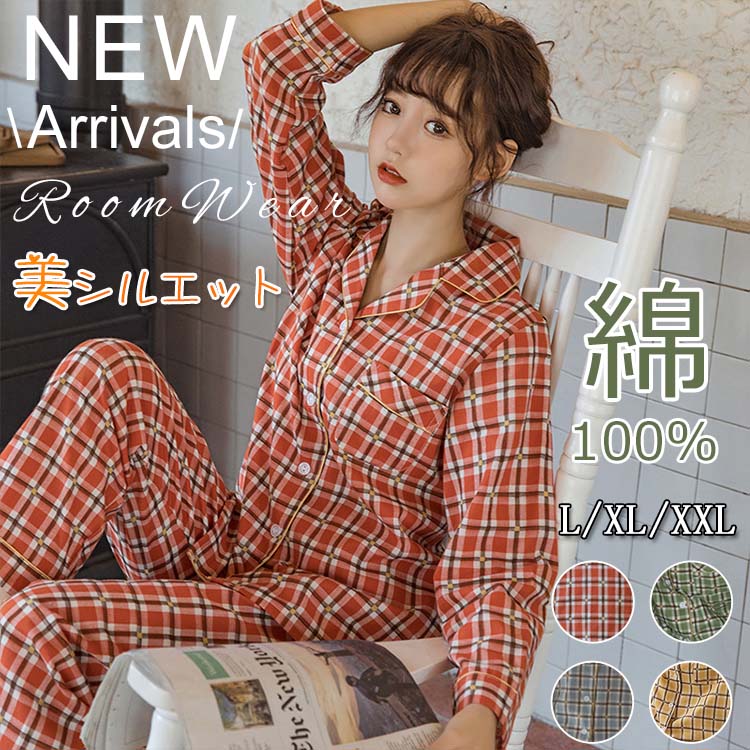 パジャマ レディース 長袖 綿100% 前開き ルームウェア 上下セット 冬 春 秋 2点セット 大きいサイズ レディース コットンパジャマ チェック柄 可愛い