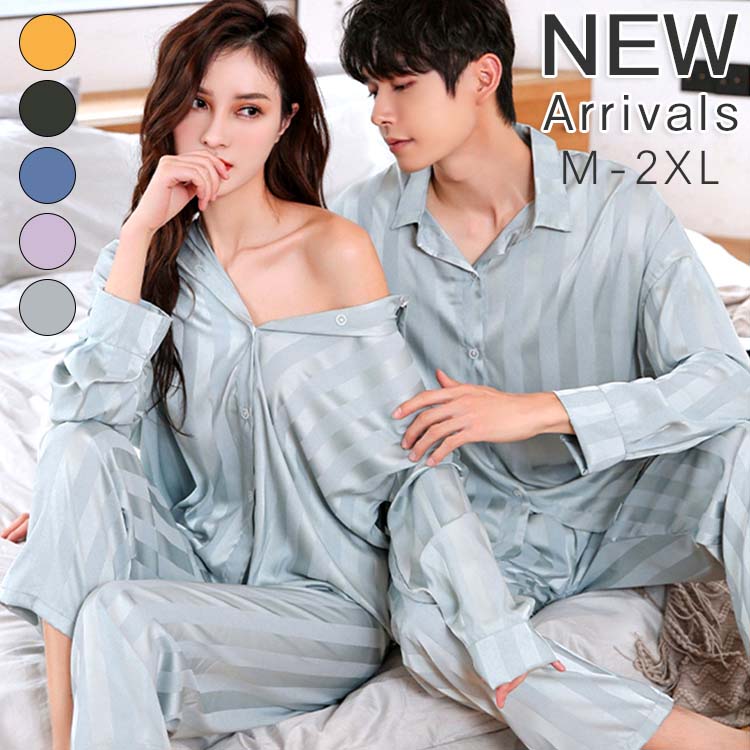 ペアパジャマ パジャマ 長袖 シルク ペアルック 夏 上下セット レディース カップル 薄手 ルームウェア 長ズボン セットアップ 大きいサイズ 前開き ユニセックス