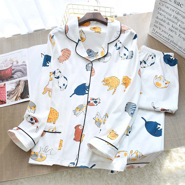 パジャマ レディース 綿100% ロング丈ズボン 長袖シャツ 猫柄 ルームウェア 上下セット 薄手 春 夏秋 ネック 折り襟 ポケット 2点セット ねこ柄 総柄 部屋着 セットアップ